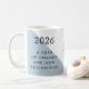 2026 Universal Year of Change and New Beginnings Motivational Quote Coffee Mug - Resolution Number 3... In Numerology, the year 2026 is a "Universal One Year" with the numbers (2+0+2+6) adding up to 10, which reduces down to 1. The number One represents change, new beginnings, originality, and new understandings, personally and globally. Some of us welcome change; others fear it, resist it, and attempt to stop it from happening, whether on a personal, nationwide, or global level. My aim with this collection of motivational mugs is to help you set your intentions (or New Year's Resolutions) for 2026 to ease the way during the chaos that can occur when major changes are taking place both within you and all over the world at the same time. Overlaid on geometric shapes in a lovely light dusty blue color, the text on one side of the mug reads "2026 A year of change and new beginnings" with the intention on the other side "This is the year I will view the new journey of change as an adventure, not as a struggle". You can revise this text, if you like, and also personalize the mug with your name and monogram initial by selecting "Details" where it says "Personalize this template". The intention text is adapted from an original saying by Barbara Casey.