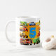 Tasse faite sur commande de camion de construction d'anniversaire de cinquième anniversaire. Neuf camions colorés lumineux entourent un grand grand numéro 5 ! Ajoutez votre propre âge ! Un mélangeur de ciment vert et jaune, bleu prennent le camion, le bouteur jaune, le camion de déchargeur orange, le rouleau de route rouge, le tracteur et la remorque verte, le grand firetruck rouge, le bêcheur jaune et le camion rouge d'un constructeur ! Des idées plus grandes pour la fête d'anniversaire orientée d'un enfant de camion de TruckStore