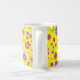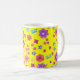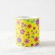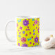 Une jolie tasse à café fleurie, avec un motif de fleurs vives en violet, turquoise, rose et orange sur un arrière - plan jaune soleil, d'un collage de papier peint à la main par Judy Adamson. Vous pouvez facilement changer la couleur de l'arrière - plan, si vous le souhaitez, en utilisant le bouton Modifier.