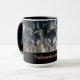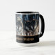 Cette tasse à café en céramique est montrée avec une photo de loups sauvages dans le parc national Yellowstone. Tan accents avec intérieur noir et poignée. Customisez cet objet ou achetez tel quel. Image stock
