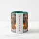 An adorable personalized Christmas coffee mug with a festive poodle sitting in front of the fireplace on a cold winter day. A Christmas tree decorated and a festive background.