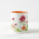 Une tasse à café colorée et lumineuse décorée de marguerites peintes en rouge, de nasturtiums oranges et d'une abeille au miel peinte en aquarelle.