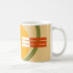 Cette tasse a un design abstrait moderne du milieu du siècle d'un cercle doré à l'intérieur d'un cercle vert avec des rayures orange et blanche.