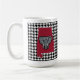 A herringbone background with the state of Alabama and an elephant. Crimson and gray colors on black and white herringbone.