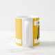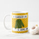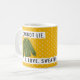 Ce design présente un amusant arrière - plan jaune doré avec des pois blancs. "JE NE PEUX PAS MENTIR. J'AIME. DOUCEUR. TEMPS." typographie le long du dessus et du bas de la tasse avec un pull vert.