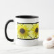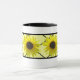 Une tasse gaie avec des tournesols se dirige sur un arrière - plan entrecroisé noir et jaune. La tasse de sonnerie est accentuée dans le noir, mais peut "être customisée" à une autre couleur.
