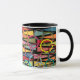 Cette tasse présente un design moderne du milieu du siècle de triangles et anneaux aux couleurs rétro sur un champ de noir.