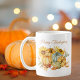 Salope de café de fête de Thanksgiving avec le libellé Bon thanksgiving au-dessus des illustrations d'aquarelle de tournesols, citrouilles orange, citrouilles bleus, gourdes vertes entourées de feuilles d'automne et de baies rouges. Ces tasses sont parfaites pour le café, le thé, le chocolat chaud ou toute autre boisson pour vous garder au chaud pendant les jours d'automne croustillants et vous mettre dans l'esprit de gratitude de cette fête de Thanksgiving.