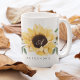 Elégante tasse à café de style champêtre tournesol personnalisé. Notre design comprend nos tournesols jaunes dorés peints à la main, des fleurs crème blanches et des espaces verts naturels aménagés pour créer cet élégant aménagement de style champêtre. Nos tournesols jaunes fleuris enveloppent la tasse de café. Customisez avec votre nom et votre monogramme. Toutes les fleurs sont peintes à la main par Moodthology Papery.