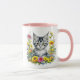 L'art de l'Ai dépeint un adorable chaton tabby gris mignon entouré de jolies fleurs jaunes et roses, dans un style aquarelle. Ajoutez un nom dans la zone de personnalisation. Cette tasse dit Tante mais vous pouvez changer cela en nom ou autre membre de la famille.