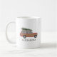 Illustration d'un camion 4x4 lambrissé de bois rouge surmonté d'un arbre de Noël. Personnalisez le nom.