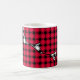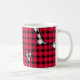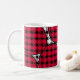 Cette tasse a un design moderne du milieu du siècle de diamants noirs solides à l'intérieur des contours de diamants noirs avec des lobs roses sous eux, le tout sur un champ de blanc.