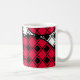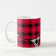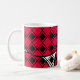 Cette tasse a un design moderne du milieu du siècle de diamants noirs solides à l'intérieur des contours de diamants noirs avec des lobs roses sous eux, le tout sur un champ de blanc.