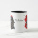 Un beau portrait en couleur d'eau d'un chien de Terre-Neuve se distingue par un arrière - plan abstrait de peinture rouge vif. L'image est sur deux côtés de la tasse, avec votre nom ou autre texte personnalisé en noir entre eux.