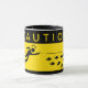 Signal de prudence jaune et noir avec piranhas poursuivant une figure de bâton.