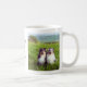 Cette tasse présente deux Shelties heureuses (tricolore et merle bleu) dans un pré. La photo est imprimée des deux côtés. Entre les photos (sur le panneau en face de la poignée, voir l'image 3) est le texte listant les traits Sheltie - loyal, aimer, intelligent.