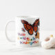 Tasse animée et colorée comportant Mlle Bindergarten, Coco dans le déguisement avec des monarques et des coccinelles.