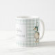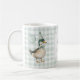 Cette tasse d'inspiration rétro présente un adorable canard habillé d'un casquette de fête et d'une cravate d'arc, tenant un ballon fantaisiste. L'arrière - plan doux vert sauge en vichy ajoute un aspect rustique et cosy.