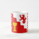 "Par pli ondulé argent et gules, un loup de mer gules et un gobelet ou."