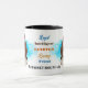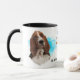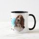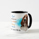 Un portrait d'un chien âpre Basset Hound est la caractéristique de deux côtés de cette tasse. Chaque image est placée sur un arrière - plan à bec bleu vif. Entre les deux images se trouve le texte qui décrit ce compagnon loyal et aimant, avec "le chien BASSET HOUND" en noir en bas. Tout le texte est facilement customisé à tout ce que vous voulez afin que vous puissiez décrire votre propre ami loyal.