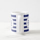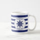 Personnalisez la tasse de ce capitaine avec votre nom. Le design comprend une roue de capitaine bleu marine avec une bordure de corde circulaire. Arrière - plan est à rayures bleues et blanches.