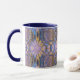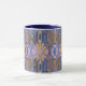 Cette tasse présente un style batik, d'inspiration tribale, en bleu, violet et jaune.