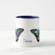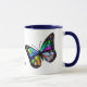 Voici une tasse lumineuse et colorée avec une belle image de papillon brillant de chaque côté. L'image artistique se décline en plusieurs couleurs : bleu, vert, jaune, rose, orange, noir, et plus ! Entre les deux images est votre texte personnalisé en bleu. Magnifique !