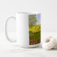 Une tasse avec une belle image d'une scène naturelle : Un oiseau assis sur une clôture patinée, des fleurs sauvages poussant autour de la clôture, un fermier sur un tracteur, travaillant sa terre, des arbres avec des feuilles, et des terres agricoles de différentes couleurs. L'arrière - plan et l'image peuvent être customisés. Le texte peut être ajouté. Oeuvre originale de W.B.