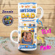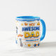 Celebrate your number one dad with this "My Awesome Dad" Photo Collage Mugs. Featuring a vibrant blue and yellow color scheme, this design is perfect for Father's Day or any occasion to show your appreciation. The playful graphics include a crown, thumbs up, stars, and a shield, all proclaiming your dad is the best. Add your own custom text to make it even more special! This mug is sure to bring a smile to his face every morning.