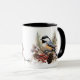 C'est une jolie tasse pour n'importe qui, avec l'image d'une petite poule experte perchée sur une branche de pin avec un cône de pin et des baies rouges. Derrière les images d'oiseaux se trouve une trace d'un tourbillon d'or. L'image est répétée deux fois sur la tasse, avec votre nom en noir entre eux. Une jolie scène pour toute saison !