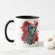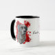 Un beau portrait couleur eau d'un Labrador Retriever noir se distingue par un arrière - plan abstrait de peinture rouge vif. L'image est sur deux côtés de la tasse, avec votre nom ou autre texte personnalisé en noir entre eux.