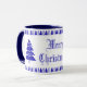 Blue and White Modern Christmas Tree and Stars Motif avec texte personnalisé Joyeux Noël en Élégant Script, vous pouvez modifier ou supprimer le texte, Saison d'hiver Fête Café Mug