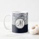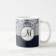 Une image numérique sans couture de motif de damassé de bleu marine noir et de gris argenté sur le dessus, et le satin bleu de marine et de minuit vintage âgé dénomment des rayures sur le fond, avec un ruban recouvert avec un joint personnalisable des textes de monogramme.