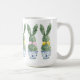 This Easter ceramic mug features cute bunny rabbit green topiaries with pink and yellow bows in blue and white chinoiserie flowerpots. Personalize with your choice of name or special holiday message. Great for Easter baskets and gift bags.