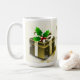 Profitez de votre café du matin pendant la saison des fêtes avec cette Mug cadeau Gold Christmas. Le design de la tasse à café présente un cadeau de Noël en or vibrant orné de baies sèches et de chutes de flocons de neige contre un élégant défilement et arrière - plan feuille avec le dicton "Ma tasse de joie". Autres cadeaux et objets de vacances disponibles avec ce design aussi.