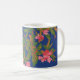 Un très joli café Mug très design, avec du japonais rose vif (coing japonais) sur un arrière - plan bleu profond ; à partir d'une sérigraphie de Judy Adamson.