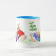 Un micro-ondes et un lave-vaisselle-coffre-fort 11 oz de tasse blanche avec une jante et une poignée bleu poudre, le design est de deux "Hot Cross Bunnies" essayant de soulever un oeuf de Pâques lourd. Voir aussi les cartes de voeux correspondantes.