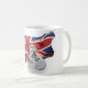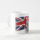 Montrée est une image photographique d'un bouledogue anglais blanc utilisant un casquette de chasseur de cerf et avec un tuyau de calebasse (inspiré par Shirlock Holmes) devant un drapeau britannique.