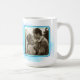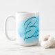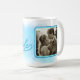 La tasse de la mariée avec un gros texte "mariée" en couleur bleu turquoise sur une peinture à l'aquarelle. La tasse n'est pas peinte à la main, c'est un design. À côté du libellé est un modèle photo carré encadré dans les mêmes couleurs. Ajoutez une photo mariage, une photo fiançailles ou autre.