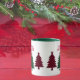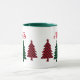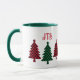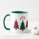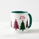 Cette tasse de vacances présente de charmants sapins de Noël en rouge et noir et noir et de buffle plaid, avec les initiales monogrammes de votre ou votre destinataire dans la typographie rouge fantaisie ci-dessus. Célébrez les fêtes ou toute la journée en buvant votre café ou en sirotant votre thé à l'épice à la cannelle. La tasse montrée ici a un intérieur et poignées couleur vert forêt, mais vous pouvez la changer en rouge, ou choisir d'autres options de tasse, tasse et stein.