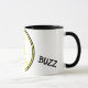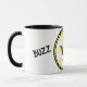 Souriant peint à la main bourdonnement d'abeille pour dire bonjour avec des rayures noires jaunes et des ailes clignotantes. Buzz est écrit en noir sur les deux côtés de la tasse. L'Arrière - plan est d'un blanc immaculé. La bordure circulaire est encadrée en noir avec des points noirs contre un arrière - plan jaune. Belle pour les mois de printemps ou d'été pour égayer le décor de la cuisine. Amusant pour tous ceux qui aiment les abeilles. Oeuvre graphique originale © TamiraZDesigns. www.zazzle.com/tamirazdesigns