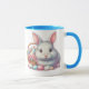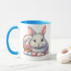 Un adorable lapin blanc de Pâques est prêt avec un panier d'oeufs pastel de Pâques et des fleurs de printemps sont prêts à se cacher le matin de Pâques. Cette jolie tasse est prête pour votre café ou thé du matin de Pâques !