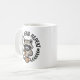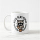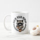 Illustration chaleureuse de style badge d'un raton laveur dans un petit tablier de barista qui verse du café à côté d'une pile de livres ouverts. L'expression "Brew Read Repeat" se trouve au-dessus, rendue en lettres de bloc conviviales et d'une teinte brun-café. Des remplissages vectoriels plats et des lignes nettes assurent que les imprimés d'oeuvres d'art sont clairement imprimés sur la céramique tout en procurant une énergie confortable de lecture et de café.
