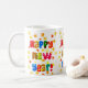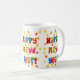 Un café Mug blanc de Nouvel An avec "Bonne Année" en lettres multicolores et orange et jaune commence éparpillé sur fond blanc. Photo d'un collage de papier peint à la main par Judy Adamson.