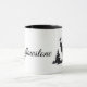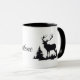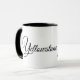 Cette tasse de café en céramique est montrée avec un imprimé d'art d'un wapiti avec du texte de Yellowstone. Intérieur et poignée noirs. Customisez cet objet ou achetez tel quel. Image stock