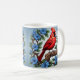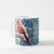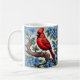 Un magnifique cardinal rouge se dresse fièrement sur une branche d'arbre délicate entourée de fleurs verdoyantes et bleues. Les détails complexes et les couleurs audacieuses évoquent un sentiment de joie et de sérénité.