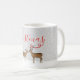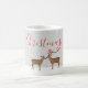 Célébrez la magie de la saison des fêtes avec cette charmante tasse Joyeux Noël présentant une scène paisible de cerfs dans les bois. Le fond enneigé doux, l'écriture calligraphique rouge élégante et le design hivernal minimaliste créent une apparence cosy et festive parfaite pour Noël.