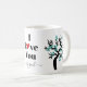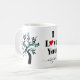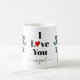Des Inséparables turquoises et noirs légers sakura cerisier et fleur de pâte à café. Une tasse personnalisée avec l'expression "Je t'aime", avec un coeur rouge au lieu de la lettre "o" et nom cadeau parfait pour la Saint Valentin.