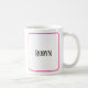 Cette tasse est décorée d'une tasse de thé et d'une soucoupe bleue, et d'un joli cupcake rose avec une cerise sur le dessus. Les mots lisent : Il est temps pour le thé et le gâteau! et sont à l'intérieur d'une bordure rectangulaire rose assortie. Vous pouvez personnaliser la tasse avec votre nom.