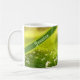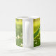 Un mignon tasse qui est parfait pour vos enfants. Cet aménagement dispose d'un terrain de fleurs verdoyant et herbeux en été. Il y a une bande verte qui traverse la tasse, et dans la bande il y a des lettres vert menthe qui sont personnalisées pour votre nom.